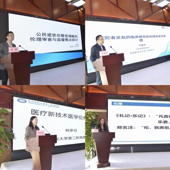 下午的课程精彩继续,北京协和医学院人文学院教授,法律与伦理学系主任睢素利,围绕“辅助生殖技术中的新型伦理法律问题”进行了专题讲座。福建医科大学附属漳州市医院伦理办公室副主任、医学伦理委员会委员兼秘书蒋辉,围绕“公民逝世后的器官捐献伦理审查与监督要点探讨”进行了学术分享。云南省医学会医学伦理学分会副主任委员、云南省肿瘤医院副院长叶联华,围绕“研究者发起的临床研究的伦理审查及管理”进行了学术交流。云南省医学会医学伦理学分会副主任委员、昆明医科大学第二附属医院内分泌科主任柯亭羽,围绕“医疗新技术医学伦理审查”进行了授课。云南省医学会医学伦理学分会常委、昆明医科大学第一附属医院医学伦理办公室副主任王婷,围绕“真实世界研究与传统临床试验伦理审查要点”进行了学术交流。