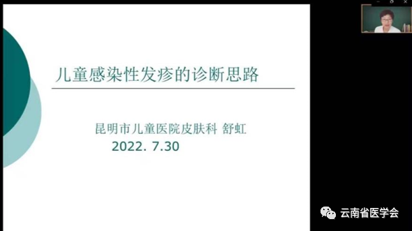 • 云南省医学会皮肤性病学分会于2022年7月30日至31日在线上举办了云南省医学会皮肤性病学分会基层大讲堂——德宏站,云南省医学会皮肤性病学分会副主任委员李玉叶教授出席开幕式并致辞,本次会议由德宏州医学会皮肤性病学分会毛雁主任委员组织并主持。